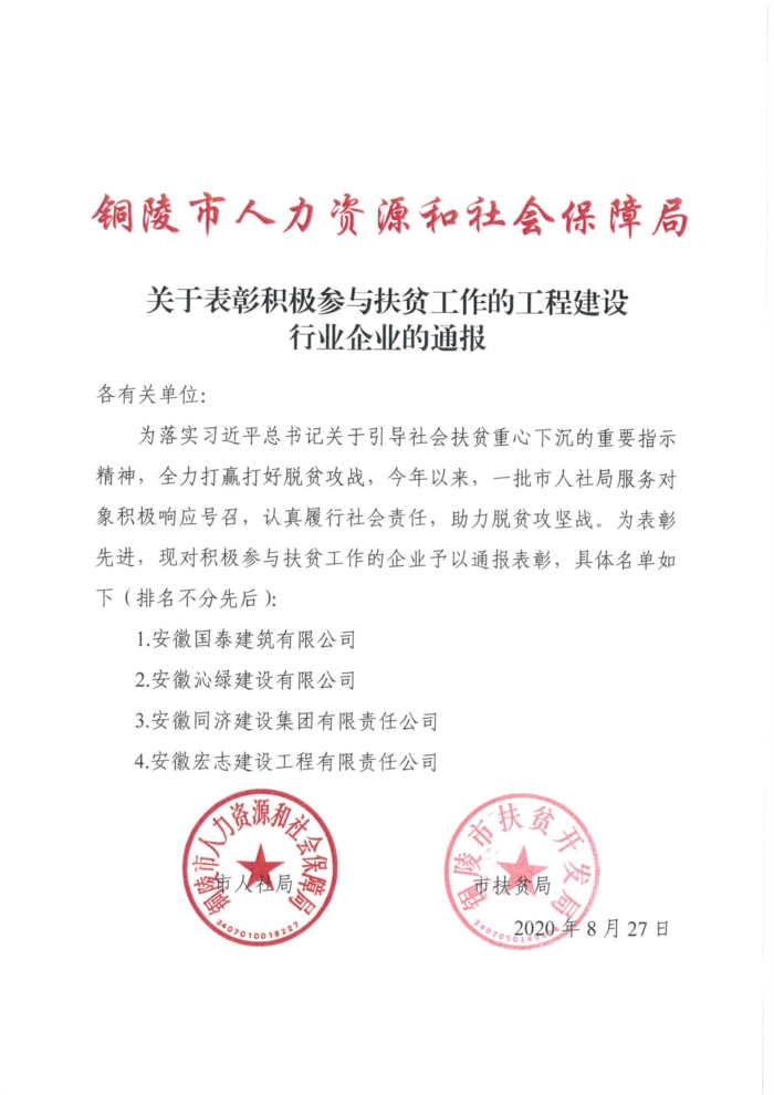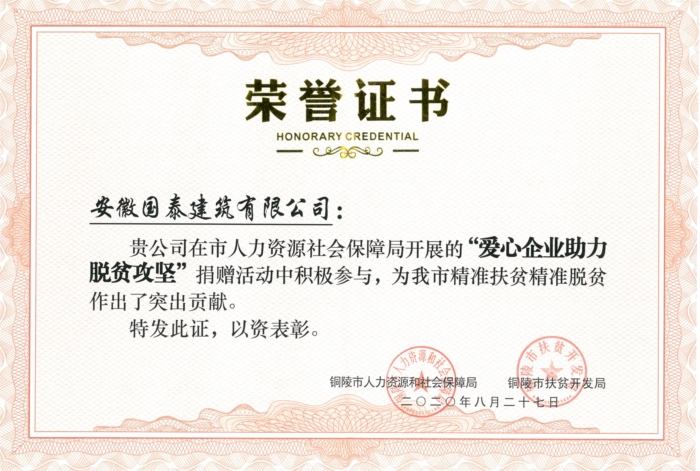 安徽國(guó)泰建筑有限公司榮獲“愛心企業(yè)助力脫貧攻堅(jiān)”先進(jìn)單位