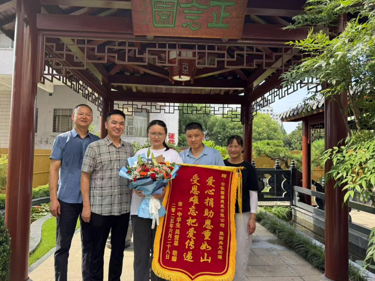 今天,高考考生吳愛恩和父母一道,專程到國泰建筑送來一面錦旗,上面繡著“愛心捐助恩重如山,受恩難忘把愛傳遞”十六個(gè)字,表達(dá)對(duì)公司張四兵總經(jīng)理最真摯的謝意。